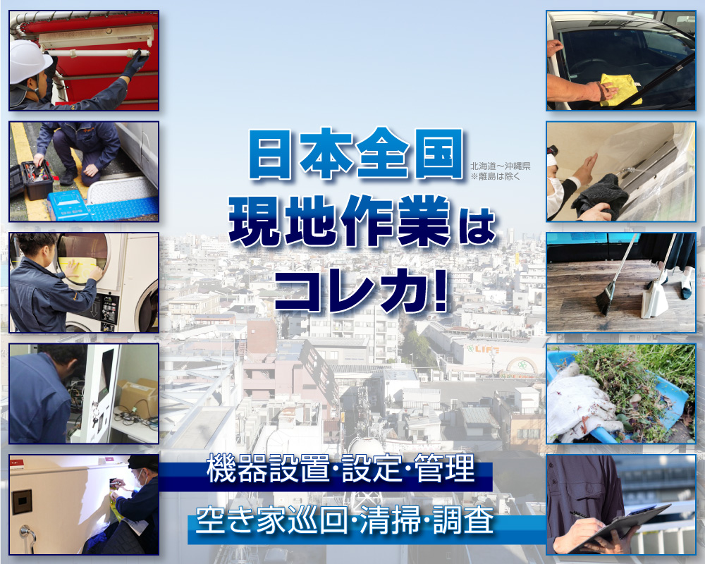 日本全国現地作業代行はコレカ! お知らせ 2022.02.01 コレカ・サポート、現地作業代行のホームページを公開しました。 全国対応で現地作業の代行できます!日本各地の空き家巡回、清掃、調査、メンテナンスはコレカ!