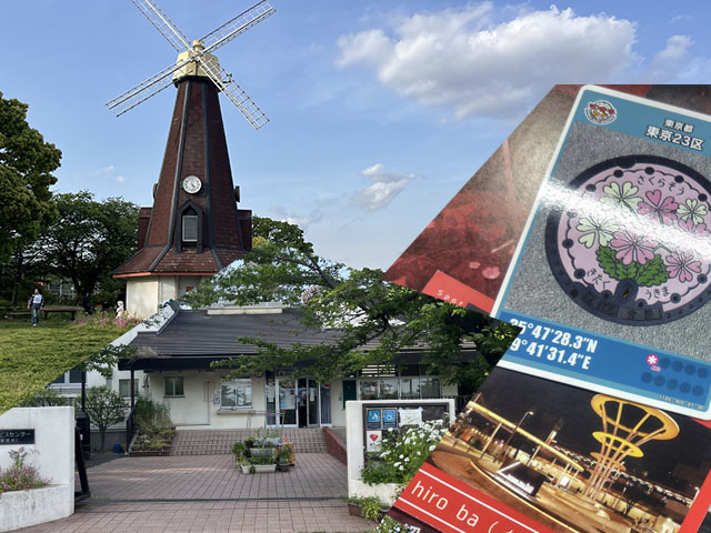 「浮間桜草」マンホールカードの配布場所は、浮間公園サービスセンター。駅から向かって左手側の風車のその奥に、サービスセンターがあります。浮間公園には、献血バスが来ていることもあります。北区の健康万歩計アプリ「あるきた」の中で、北区の史跡を巡るコールがいくつかありますが、浮間公園周辺を散策するコースもあります。
